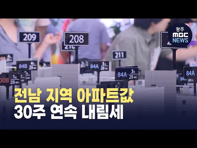 전남 지역 아파트 매매가격이 30주 연속 하락했습니다.한국부동산원이 발표한 6월 셋째 주 아파트가격 동향을 보면 이번 주 전남 지역 아파트값은지난주와 비교해 –0.05% 하락했습니다.전남 아파트값은 지난해 11월 셋째부터 30주 연속 내렸으며,올해 누적 변동률은 –1.2%를 기록했습니다.