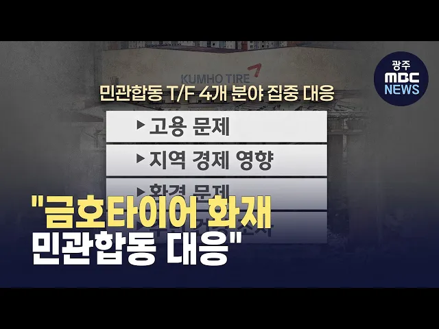 (앵커)금호타이어 광주공장 화재와 관련해 광주시가 민관합동 데스크포스를 구성하고 본격적인 대책 마련에 나섰습니다.고용 문제와 지역 경제, 환경, 주민건강 등을 4개 분야로 나눠 집중 대응할 예정입니다.보도에 김영창 기자입니다.(기자)금호타이어 광주공장 화재로 인한 지역 경제에 미치는 타격이 가시화되고 있습니...