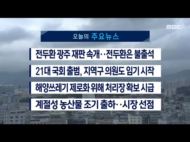 다음은 오늘의 주요뉴스입니다. -------------------------------------- 전두환 광주재판이 오늘 오후 광주지법에서 열립니다. 전두환은 나오지 않을 예정인 가운데 5.18 헬기사격과 관련한 핵심증인이 출석할 예정입니다. --------------------------------------- 21대 국회가 출범하면서 광주전남 지역구 국회의원 18...