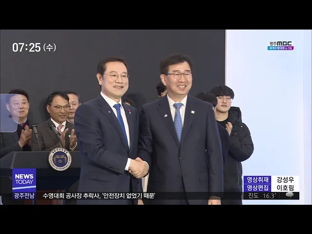 오늘의 주요뉴스... 광주 도시철도 2호선 착공이 세계 수영대회가 끝나는 8월 하순쯤으로 미뤄졌습니다. ------------------------------------------- 광주 군공항 이전이 늦어지면서 소음 피해 보상금이 천문학적 수준으로 늘어나고 있습니다. 국방부가 군공항 이전과 소음 피해 대책에 너무 소극적이라는 지적이 나오고 ...
