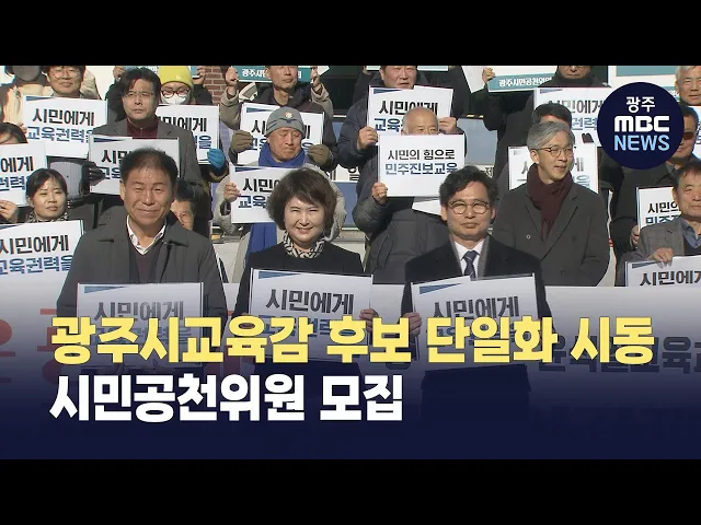 광주지역 시민사회단체를 중심으로 한 진보 진영이 광주시교육감 후보 단일화 절차에 들어갔습니다.광주민주진보시민교육감 시민공천위원회는 오늘(8일) 기자회견을 열고, 내년 1월 중순까지 시민공천위원 2만 명을 모집한 뒤 정책토론회와 여론조사를 거쳐 단일 후보를 정하기로 했다고 밝혔습니다.이번 기자회견에는 김용...