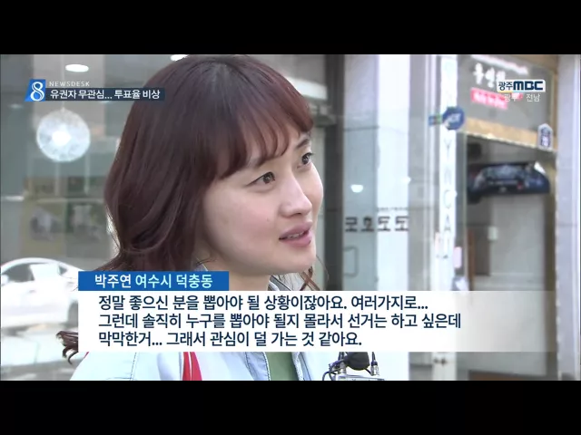 1.20대 국회의원 선거가 사흘 앞으로 다가왔습니다. 총선 전 마지막 휴일을 맞아 광주.전남 격전지를 중심으로 유권자들의 표심 확보를 위한 막판 총력전이 펼쳐졌습니다. /////////////////////////////////////////// 2.후보자들의 열띤 유세전에도 불구하고 유권자들의 무관심이 심상치 않습니다. 높은 사전 투표율과는 ...