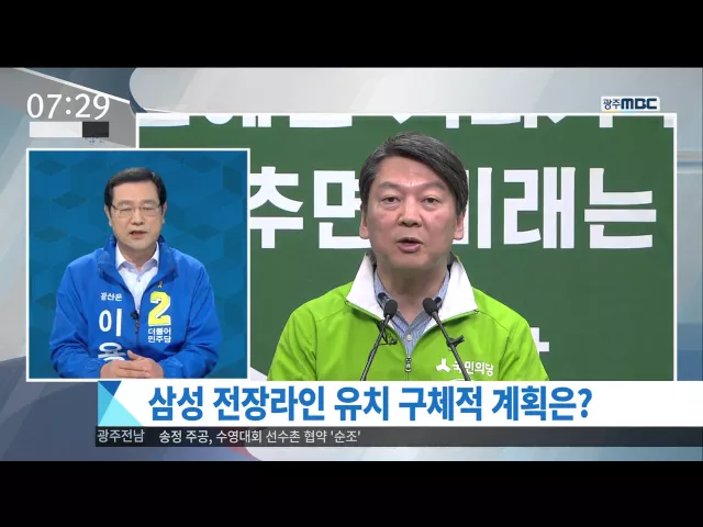 더불어민주당이 삼성 미래차 광주 유치 공약을 승부수로 던지자, 국민의당이 선심성 공약이라고 맞받아치며 공방을 벌이고 있습니다. ------------------------------------------- 화정동 선수촌 아파트에 며칠 뒤면 입주가 시작됩니다. 평소에도 차량 혼잡 구간이어서 교통 대란이 우려됩니다. -------------------------...