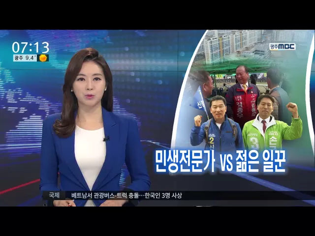13일간의 공식 선거운동이 시작됐습니다. 첫날부터 후보들의 기선잡기 경쟁이 뜨거웠습니다. ============================================ 광주의 한 마을 주민들이 국회의원 후보들을 불러 골목 토론회를 열기로 해 화제입니다. ============================================ 호남고속철도가 개통한지 1년이 지났습니다...