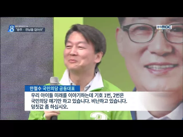 4.13 총선을 열흘 앞두고 광주는 국민의 당 우세, 전남은 혼전 양상을 보이고 있습니다. ************************ 개별 후보들의 돌출 행보가 '지역 민심이다, 무리수'다는 추측과 의혹을 낳고 있어 선거 막판 어떤 변수로 작용할 지 주목됩니다. ** 기아 타이거즈가 오늘 엘지를 상대로 홈 개막전을 치릅니다. 개막 2게임...