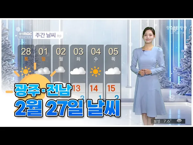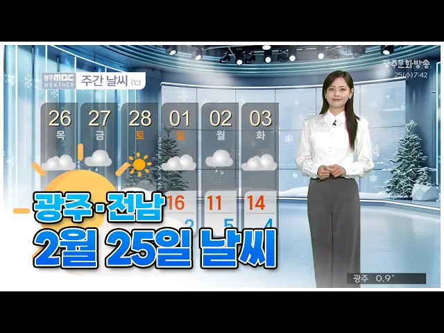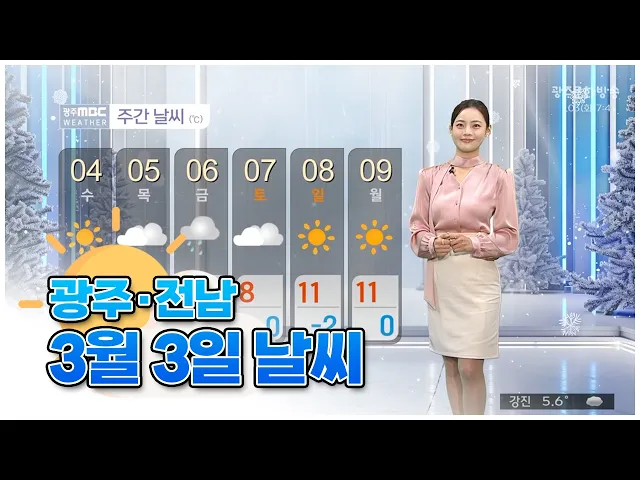 오늘은 날이 흐린가운데비가 지나겠습니다.광주와 전남에 5~30mm의 비가 예상되는 가운데지리산 부근을 중심으로는더 낮은 기온에 1~3cm의 눈이 지날 수 있습니다.오늘과 내일 눈이나 비가 지나면서빙판길과 도로 살얼음이 나타나는 곳이 있겠습니다.교통안전과 보행자 안전에 각별히 주의하시기 바랍니다.비 소식이 들어있...