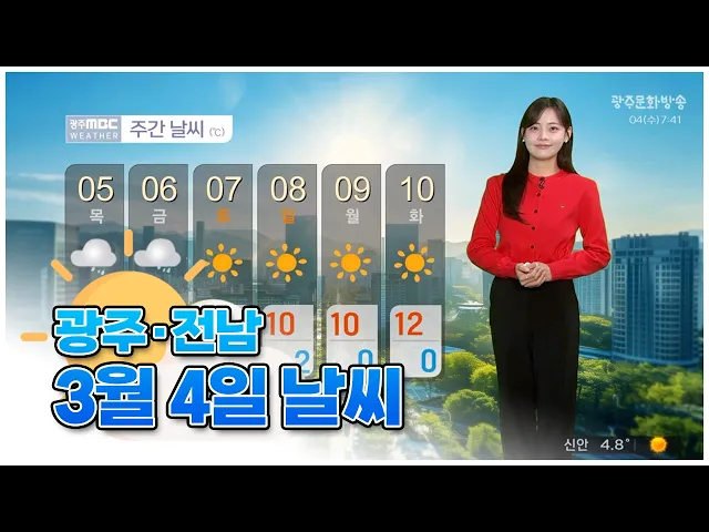 현재 제주 남쪽 해상을 지나는저기압의 영향으로광주와 전남에 시간 당 1~2mm 안팎의비가 지나고 있습니다.오늘 예보된 우리지역 강우량은 5mm 안팎으로오늘 오전까지 약한 빗줄기가 이어지겠고,오후들어서는빗방울만 떨어질 것으로 보입니다.종일 흐린 날씨가 예상됩니다만,기온은 여전히 평년보다 높게 오르겠습니다.아침...