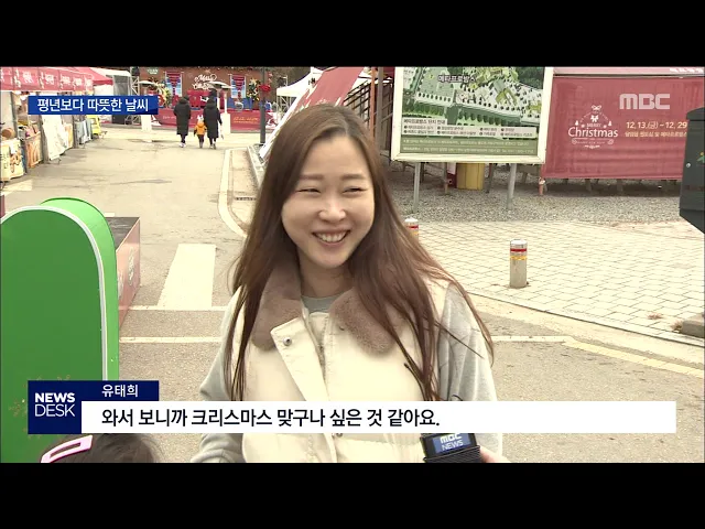 ◀ANC▶ 다음주면 벌써 성탄절인데, 이맘때 원래 이렇게 따뜻했나 싶을 정도로 추위가 덜합니다. 올 겨울철 날씨가 어떤지. 자세한 날씨정보와 성탄절 날씨 전망을 이다솔 기상캐스터가 전해드립니다. ◀VCR▶ 성탄절이 어느덧 5일 앞으로 다가왔습니다. 담양의 메타프로방스도 성탄절을 맞이할 단장을 마쳤습니다. 알록...