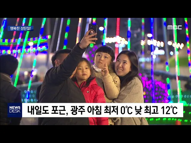◀ANC▶ 오늘 종일 포근한 날씨가 이어졌습니다. 성탄전야인 지금 상황은 어떤지. 또 내일 성탄절 날씨는 어떨지. 양림동 크리스마스 문화축제현장에 나가있는 기상캐스터 연결해 알아보겠습니다. 이다솔 기상캐스터! ◀VCR▶ 네! 저는 지금 양림동 크리스마스트리 문화축제 현장에 나와 있습니다. 지금 이곳에는 성탄전...