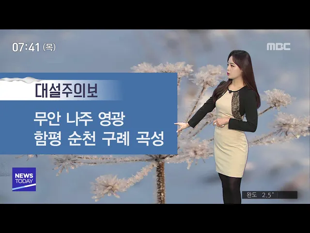 주말인 오늘 광주 전남은 기온이 크게 떨어지고 찬바람이 불었습니다. 일요일인 내일(27)도 아침 최저기온이 광주 영하 6도를 비롯해 영하 8도에서 영하 4도의 분포로 춥겠습니다. 영광과 무안 등 전남 서해안 7개 시군엔 강풍주의보가 내려져 있어 체감기온은 더욱 낮겠습니다. 내일 낮부터는 다시 기온이 올라 평년보다 ...