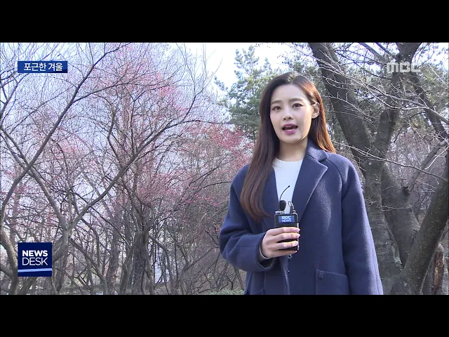 ◀ANC▶ 겨울이 맞나 싶을 정도로 포근한 날씨가 이어지고 있습니다. 상대적으로 높은 기온 탓에 도심의 공원에서는 때 아닌 홍매화가 하나 둘 피어나고 있습니다. 이다솔 기상캐스터가 전해드립니다. ◀VCR▶ 봄의 시작을 알리는 봄의 전령사. 홍매화가 꽃망울을 활짝 터뜨렸습니다. 올망졸망한 매화꽃에서 봄기운이 물...