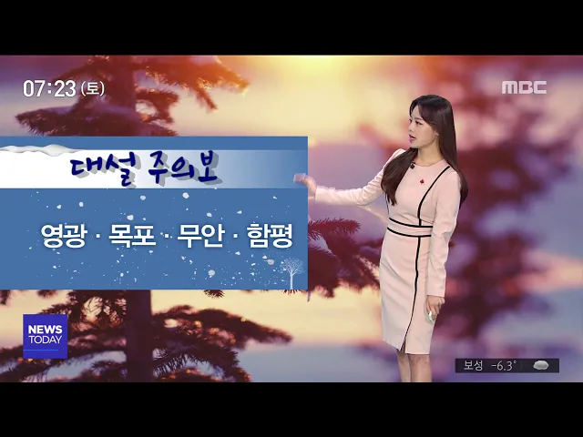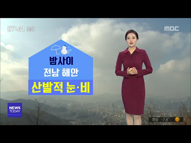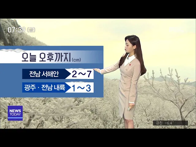 내일 아침까지 서해안과 전남 내륙지역에 눈이 내리겠습니다. 광주지방 기상청에 따르면 밤 사이 전남 일부 지역에 눈이 내려 서해안 지역에 3~10센티미터, 전남 북부 내륙에는 1~3센티미터의 눈이 쌓이겠습니다. 모레까지 기온이 큰 폭으로 떨어지겠고, 바람도 강하게 불어 체감온도는 더욱 낮을 것으로 예상됩니다. 기상...