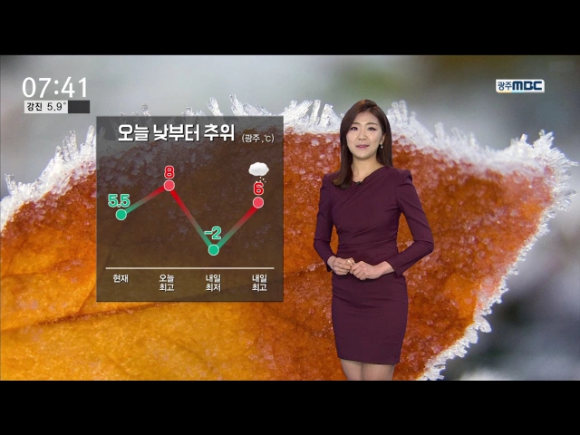 낮부터 찬공기가 남하하면서 추위가 몰려왔습니다. 오늘 광주의 낮 최고 기온이 8.7도로 어제보다 6도가량 낮았습니다. 내일은 기온이 더 떨어지면서 낮기온 6도로 평년기온과 비슷하겠지만 찬바람이 불면서 체감기온은 더 낮겠습니다. 대체로 맑은 가운데 내일 오후 한 때 눈이 날리는 곳이 있겠습니다. 기상청은 이번주 ...