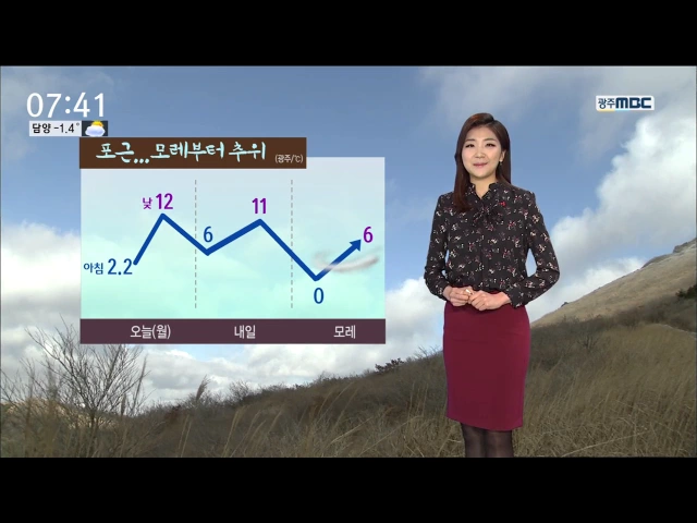 '대설'인 내일 아침에는 영하로 기온이 떨어지겠습니다. 광주의 내일 아침 기온 영하 2도로 오늘보다 5도 가량 낮겠고 찬바람이 강하게 불겠습니다. 낮에는 최고 기온이 11도로 일시적으로 평년기온 회복하겠지만 산발적으로 빗방울이 떨어지는 곳이 있겠습니다. 내일 밤부터는 찬 공기가 남하하면서 다시 추위가 몰려오겠...
