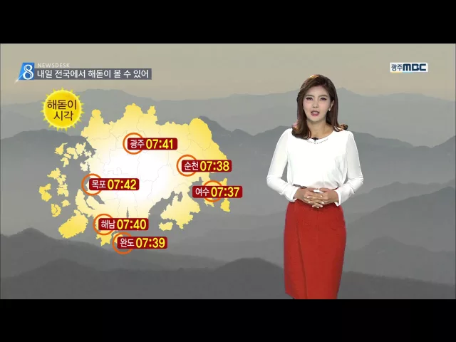 ◀ANC▶ 새해 첫날, 해맞이 가시려고 계획하신 분들 있으실 텐데요. 대부분의 해맞이 명소에서 해뜨는 모습을 볼 수 있을 거라고 합니다. 김은수 기상캐스터입니다. ◀VCR▶ 을미년 올 한 해의 마지막 태양은 광주,전남지역에서 오후 5시 30분을 전후해 모두 저뭅니다. 우리나라에서 해가 가장 늦게 지는 곳, 전남 서남해...