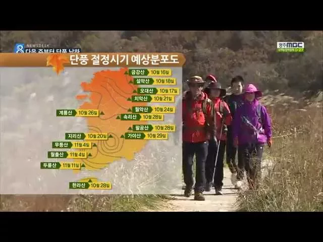 (앵커) 올해 첫 단풍은 이달 25일, 설악산에서 시작해 무등산은 다음달 20일 부터 볼 수 있을 전망입니다. 김은수 기상캐스텁니다. ========= ◀VCR▶ 높고 파란 가을 하늘 아래 형형색색으로 물드는 가을 산. 1년에 한 번 자연이 우리에게 주는 선물입니다. 올가을 단풍은 예년보다 하루 이틀 일찍 시작됩니다. ◀INT▶ ...