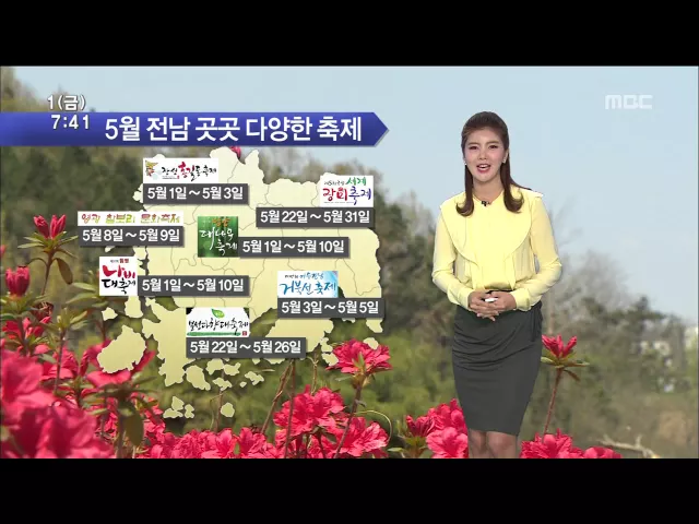 ##[ 앵커멘트] 내일부터 사실상 징검다리 연휴가 시작됩니다. 곳곳에서 축제도 열린다는데요 연휴날씨 소식과 함께 알아보겠습니다. ##[질문1] 김은수 캐스터/ 먼저 어디서 어떤 축제들이 열리는지 알려주시죠. ==== 네, 5월이 시작되는 내일부터 전남 곳곳에 풍성하고 다양한 축제가 펼쳐집니다. 함평에는 나비대축제, 담...