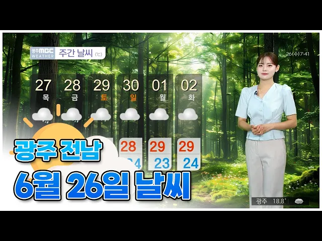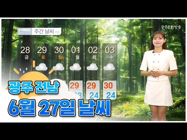오늘 밤부터는 또다시 장맛비가 예보된 가운데낮까지는 더운 날씨가 이어지겠습니다. 광주의 출근길 기온 어제와 비슷한 가운데 오늘 낮 최고기온 30도로 어제보다 1-2도 가량 높은 기온이 예상됩니다. 하늘 모습 보실까요? 고기압의 가장자리에 들면서 대체로 맑은 하늘 드러나 있는데요. 오후 들어서는 날이 점차 흐려지...