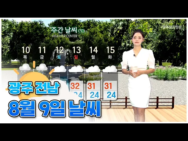 태풍은 지났지만 흐린 날씨가 이어지고 있습니다. 현재 하늘에는 구름 많은 상태고요 오늘 오전까지는 약한 빗방울이 떨어지는 곳도 있겠습니다. 오늘 오전 중에 예상되는 비의 양은 5mm 미만으로 아주 적은 양이 되겠습니다. 태풍이 지나자마자 곧바로 더위가 이어지고 있습니다. 폭염 특보는 해제됐지만 오늘 광주의 한...