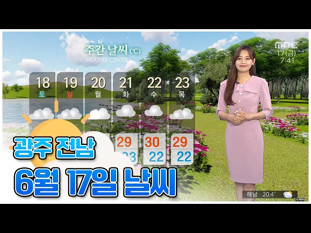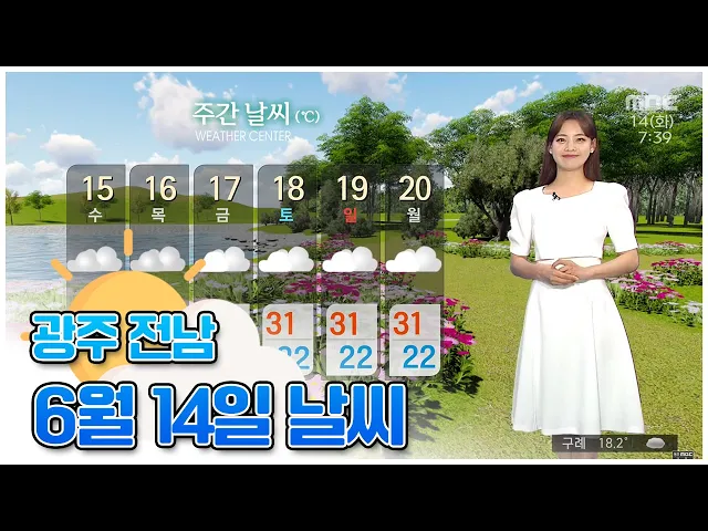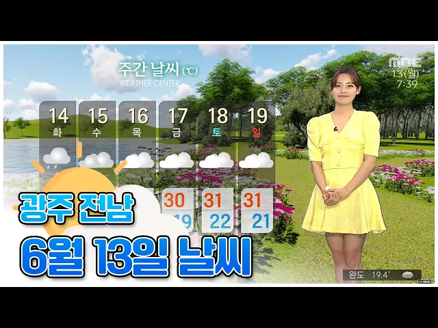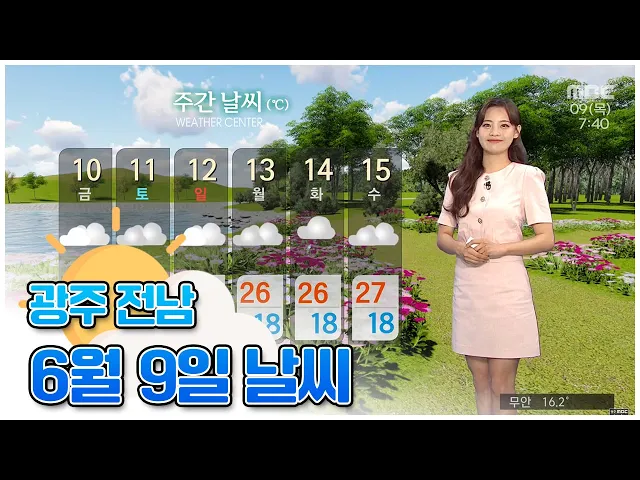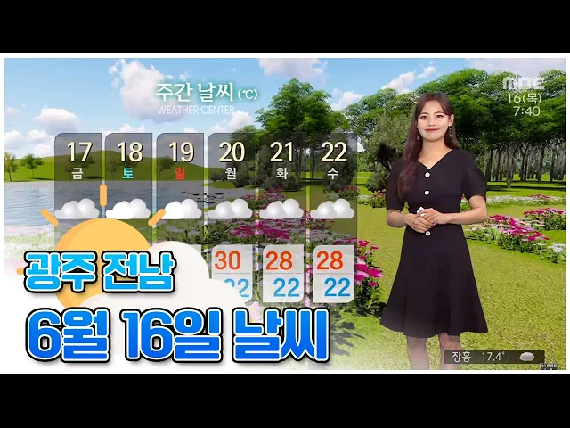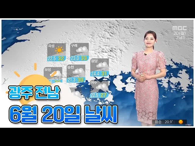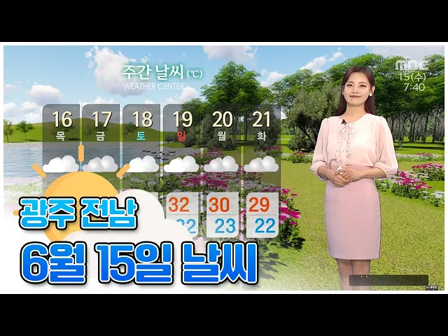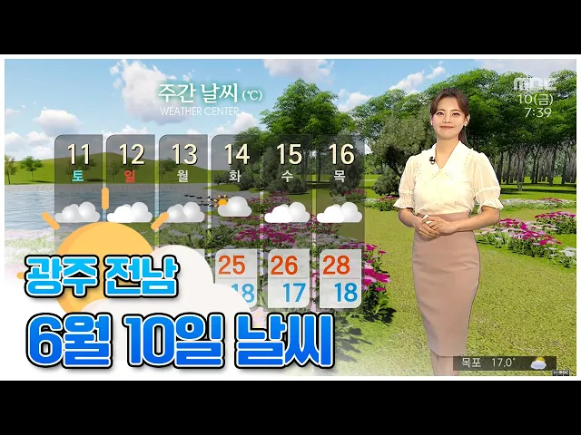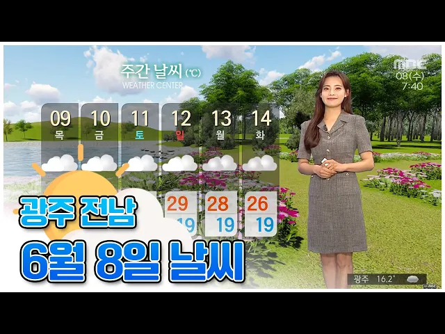 금요일 아침, 후텁지근한 기운이 가득하죠 오늘 오전까지 광주와 전남 서부를 중심으로 비가 내리겠습니다. 예상되는 비의양은 5mm 안팎으로 많지 않겠습니다. 오후들어서는 날이 개겠지만, 낮 동안에는 대기불안정으로 인한 소나기 소식이 들어있습니다. 전남북부내륙을 중심으로 갑작스런 비가 쏟아질 수 있겠습니다. 예...