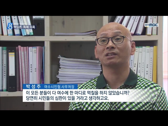 ◀ANC▶ 국민의당 안팎에서 제보 조작 사건에 대한 '정치적 책임을 지라'는 비난의 목소리가 높아지고 있습니다. 여기에 여수에서 개발사업 특혜 의혹까지 불거지면서 내년 지방선거를 앞둔 지역 정가가 벌써부터 뒤숭숭하기만 합니다. 문형철 기자입니다. ◀VCR▶ 제보 조작 사건 자체조사 결과에 대해 지역 시민단체는 ...
