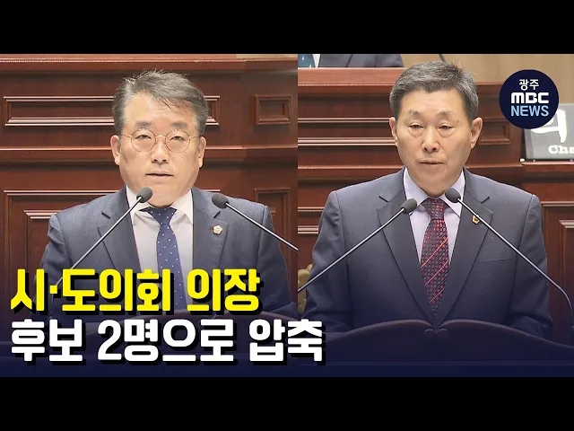 (앵커) 광주시의회와 전남도의회가 9대 의회 전반기 원 구성을 서두르고 있습니다. 시*도 의회 모두 의장 후보가 사실상 민주당 후보 2명으로 압축됐는데, 이번에도 절대 다수인 민주당이 단독으로 의장단을 뽑는 관행은 되풀이되게 됐습니다. 한신구 기자의 보도입니다. (기자) 제 9대 광주시의회 전반기를 이끌어갈 의장 ...
