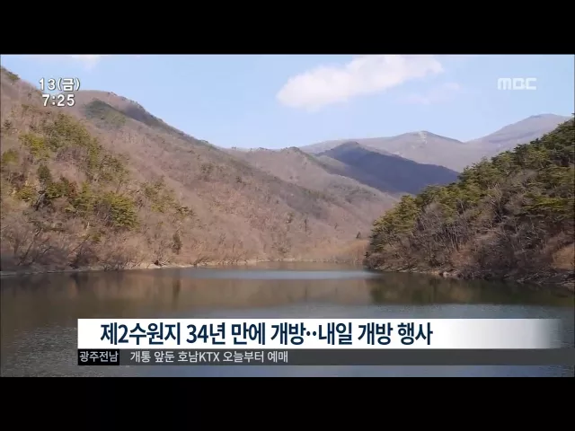 (앵커) 광주시민의 상수원인 제 2수원지는 지금은 보호구역으로 묶여 출입이 통제되고 있지만 한때 인기있는 유원지였습니다. 이 추억의 공간이 34년만에 시민의 품으로 되돌아옵니다 정용욱 기자입니다. (기자) 초록 물감을 풀어놓은 듯 진한 비취색으로 물들어 있는 제 2수원지... 1981년 상수원 보호구역으로 묶이면서 ...