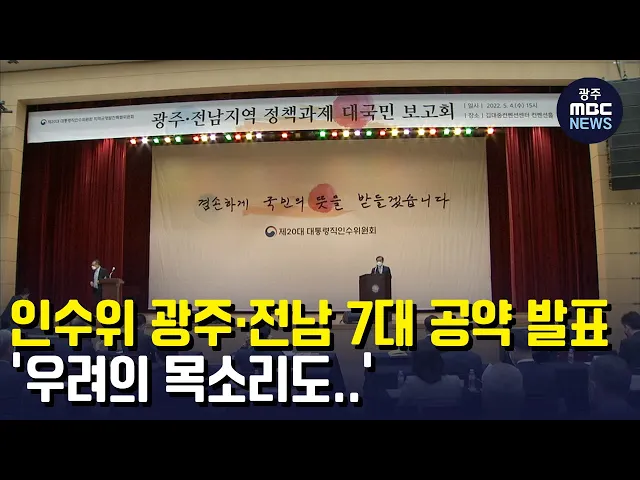 (앵커) 대통령직인수위원회가 광주를 찾아 광주*전남지역 정책과제 대국민 보고회를 열었습니다. 광주 전남의 7대 공약과 15대 정책과제의 이행 방안을 설명했는데 광주*전남이 요청했던 사업들이 일부 빠져있어 우려의 목소리가 제기됐습니다. 송정근 기자입니다. (기자) 윤석열 대통령직인수위 지역균형발전특별위가 광주...