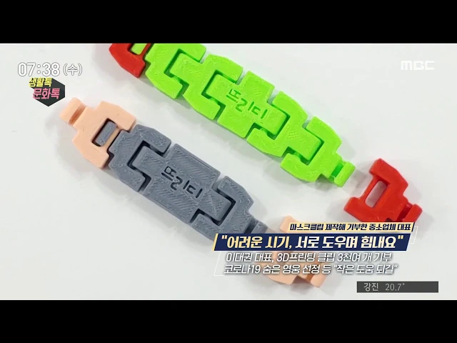 (타이틀 후, BGM 있습니다) ===(N.A)================================= (생활 1.) 광주의 한 3D 프린팅 업체 대표가 자체 제작한 마스크클립을 기부해 온 사실이 알려지면서 화제를 모으고 있습니다. 이대권 대표는 하루 종일 마스크를 쓰는 아내가 귀 통증을 호소하는 것을 보고 클립을 직접 제작하게 됐는데요. 하루에 5...