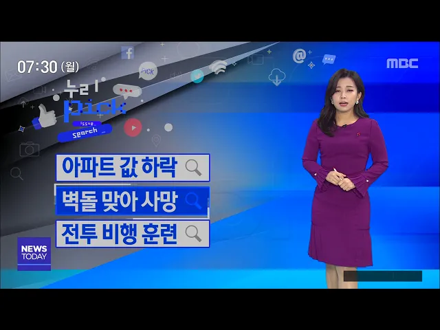 (뉴스리포터) 한 주간 누리꾼들의 관심사를 키워드로 정리해보는 '누리 픽' 시간입니다. 지난 한 주, 어떤 키워드가 많은 관심을 받았을까요? ' 아파트 값 하락 ' ' 벽돌 맞아 사망 ' ' 전투 비행 훈련 ' 이 있었습니다. 어떤 내용인지, 먼저 ' 아파트 값 하락 ' 부터 살펴보겠습니다~ ===================================...