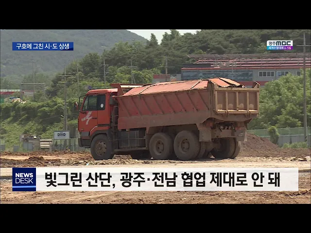 (앵커) 민선 7기 시작과 함께 이용섭 광주시장과 김영록 전남지사는 상생과 협력을 약속했습니다. 하지만 광주와 전남이 함께 풀어야 할 현안들은 오히려 뒷걸음질 치고 있습니다. 이계상 기자... (기자) 광주 광산구와 전남 함평군이 경계를 이루는 지역에 빛그린 산업단지가 조성되고 있습니다. (c.g) /총 면적 4백만 제...