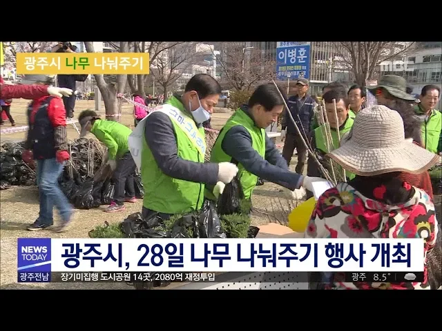 광주시가 봄철 나무심기 붐 조성을 위해 오는 28일 오전 11시 시청 야외음악당에서 나무 나눠주기 행사를 개최합니다. 이번 행사에서 제공하는 나무는 대추나무와 서향나무, 앵두나무 등 4가지 종 8천여 그루고 시민 2천명에게 1인당 4그루씩 선착순 무료로 나눠줍니다.