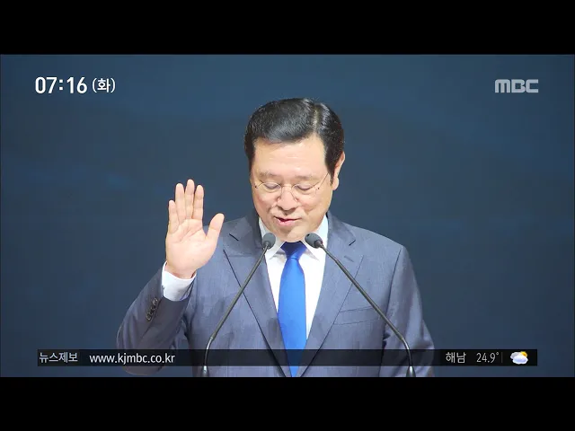 (앵커) 민선 7기가 시작됐습니다. 북상하는 태풍 때문에 취임식이 취소되거나 축소됐지만 그래도 잘해보겠다는 다짐만큼은 한결같았습니다./ 이용섭 광주시장은 취임 일성으로 '일자리'를 강조하면서, 현대차 투자 성사를 최우선 현안으로 꼽았습니다. 정용욱 기자입니다.// (기자) (현장 - 프리젠테이션) 프리젠테이션을 ...