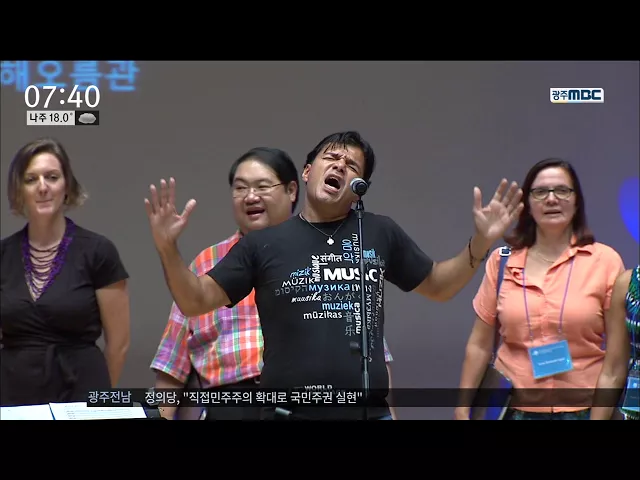 (앵커) ◀ANC▶ 뉴욕 UN 본부의 직원들로 구성된 UN 합창단이 창단 70주년을 맞아 한국을 방문했습니다. 인권과 예술의 도시 광주에서도 시민들과의 합창을 통해 화합과 평화의 메시지를 전했습니다. 이미지 뉴스리포터입니다. (리포터) ◀VCR▶ 세계 35개국에서 온 50여명의 사람들이 각기 다른 목소리로 하나의 하모니...