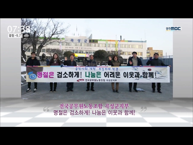 광주 동구가 설 명절을 앞두고 깔끔한 거리를 만들기 위해 대청소에 나섰습니다. (25) 보성지역아동센터 아이들이 설을 맞아 보성제일요양병원 어르신들을 찾아가 수어로 노래를 부르는 등 재능 기부를 했습니다. (25) 전국공무원노동조합 곡성군지부가 검소한 명절을 보내기 위해 '안 주고 안 받기' 캠페인을 펼쳤습니다. ...
