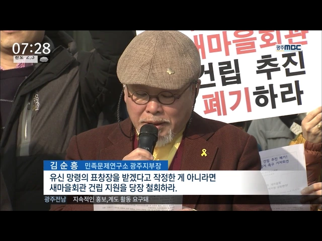 (앵커) 광주시가 새마을회관을 짓는 데 예산을 지원하기로 해서 논란이 있었는데요. 예산 지원을 보류하고 시청사의 새마을기 게양도 중단하기로 했습니다 시민단체의 요구를 못 이기는 척 수용하는 모양새를 취했습니다. 윤근수 기자 (기자) 주말마다 금남로에서 촛불집회를 열어온 박근혜 퇴진 광주시민운동본부가 이번에...