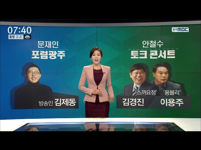 민주당의 문재인 전 대표와 국민의당의 안철수 전 대표. 야권의 유력한 대권 주자들이죠. 이 두 사람이 오는 일요일, 광주에서 격돌합니다. 먼저, 문재인 전 대표는 '포럼광주'라는 이름의 지지모임에 참석합니다. 안철수 전 대표는 국정농단 사태에 대한 토크 콘서트에 참석할 예정입니다. 두 행사는 한 시간 간격으로 열...