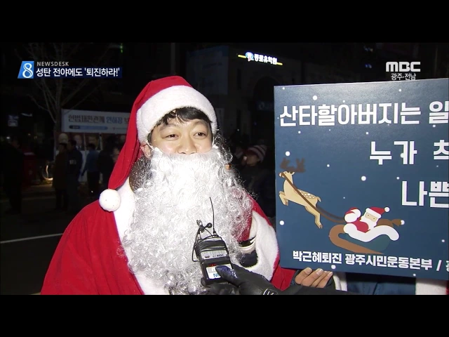 크리스마스 이브인 오늘도 박근혜 대통령 퇴진을 요구하는 촛불이 어김없이 켜졌습니다. 탄핵으로 혼란스런 정국에도 성탄의 기쁨을 나누는 훈훈한 마음 또한 거리에 넘쳤습니다. 박수인 기자 ◀VCR▶ 수천 수만개의 촛불들이 또 다시 금남로 거리를 밝혔습니다. 온누리에 평화가 가득한 성탄 전야, 하지만 평화는 그냥 주...