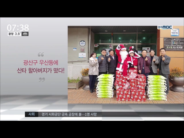 KIA 타이거즈가 연말을 맞아 올 시즌 동안 적립한 성금과 후원 물품을 영아일시보호소에 전달했습니다.(22) 광주 광산구 우산동 지역사회보장협의체가 산타클로스로 변신해 한부모 가정의 아이들에게 선물을 전달했습니다. (21) 한국관광공사가 21세기 장성아카데미에서 '한국 관광산업의 미래와 관광공사의 역할'에 대한 ...