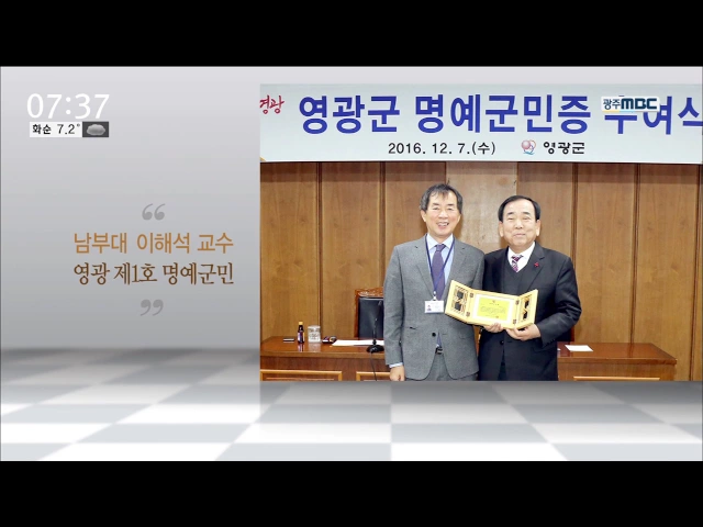 남부대학교 이해석 교수가 영광모싯잎 송편이 인기를 얻는데 기여한 공로로 영광군으로부터 제1호 명예군민증을 받았습니다. (7) 광주 무등청년회의소 유석우 상임부회장이 2017년도 신임회장으로 취임했습니다. (7) 광주 동구치과의사회가 혼자 사는 어르신과 장애인 등 이웃들에게 김장김치를 선물했습니다. (7) 영광군 ...