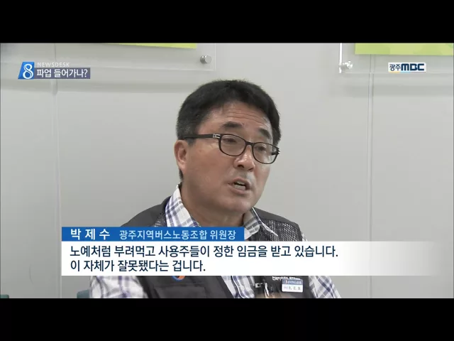 (앵커) 광주시내버스 노사가 임금협상안을 놓고 막판 진통을 거듭하고 있습니다. 조정이 결렬되면 다음주 파업에 돌입할 가능성이 있습니다. 쟁점이 무엇인지 김철원 기자가 설명합니다. (기자) 광주시내버스 노사 대표가 전남지방노동위원회에서 만났습니다. 이번이 세번째인 조정이 결렬되면 시내버스 노조는 내일부터 파...