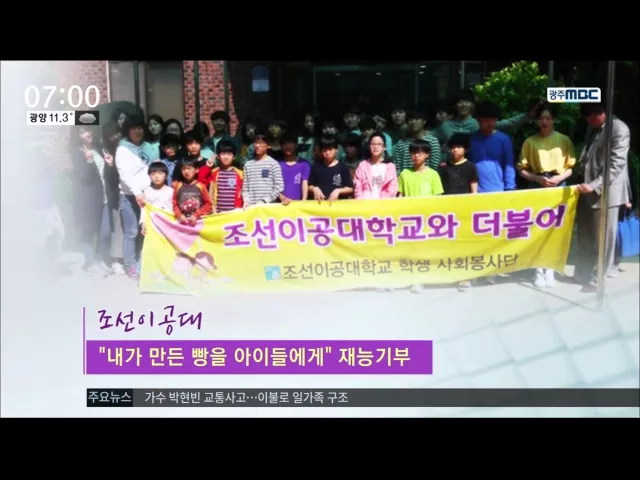 광주대학교 청년무역전문가 양성사업단이 중국에서 열린 선물용품박람회에서 중소기업 수출 도우미로 활약했습니다. (28) 조선이공대학교 학생들이 노틀담 형제의 집을 찾아가 직접 만든 빵을 선물하는 등 재능기부 봉사활동을 했습니다. (28) JB금융그룹 광주은행이 경기도 일산에 지점을 열고, 개점식을 가졌습니다. (29...
