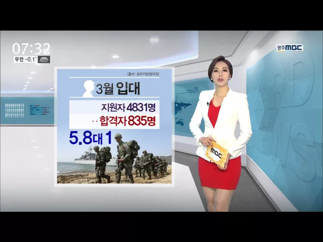 군 입대.. 하늘에 별따기가 된지 오래입니다. 광주에서 이번 달 군입대에 지원한 사람은 사천 팔백명 정도. 이 가운데 830여 명이 군입대에 성공했는데요. 평균 5.8대 1의 경쟁률을 보였습니다. 군 입대 경쟁이 치열한 곳은 해병대인데요. 무려 9 대 1의 경쟁률을 뚫어야 입대할 수 있습니다. 입영 경쟁이 치열해진 이유 중...