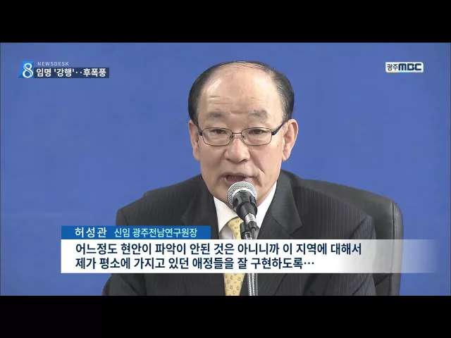 광주전남연구원이 오늘 (22일) 광주공무원교육원에서 기자회견을 열고 허성관 내정자에 대한 임명 여부를 최종 발표할 예정이라고 밝혔습니다. 연구원 이사진은 이 자리에서 간담회를 갖고 허 내정자의 선임 여부를 협의한 뒤 선임 여부와 성명서를 발표할 예정입니다. 한편 시*도의회는 지난 달 허 내정자에 대한 인사 청...