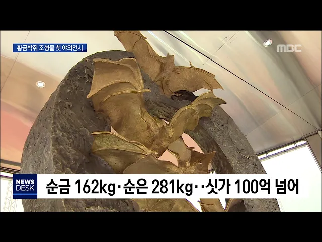 ◀ANC▶ 함평에 있는 황금박쥐 조형물은 얼마 전, 절도 미수 사건으로 전국적으로 유명해졌는데요. 시가가 백억 원에 달한다는 이 조형물이 처음으로 동굴 밖에 전시됐습니다. 문연철 기자가 보도합니다. ◀END▶ ◀VCR▶ 동굴 속 전시관에 있던 황금박쥐 조형물이 무진동 특수 차량으로 옮겨집니다. 함평엑스포공원으로...