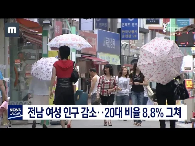 전남지역 여성 인구가 감소하는 가운데 젊은 층 여성 인구 비율도 빠르게 낮아지고 있습니다 호남통계청이 발표한 2018년 전남 여성의 삶을 보면 전남지역 여성 인구는 89만4천 명으로 일년 전보다 7천 명 줄었으며 이가운데 50대가 전체 16점1%로 가장 많고 40대와 60대가 그 다음을 이었으며 20대는 8점8%에 그쳤습니다....