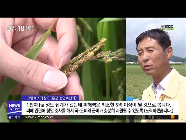 ◀ANC▶ 태풍 '솔릭'의 영향으로 수확을 앞둔 벼가 새까맣게 변했습니다. 수확량이 예년보다 크게 줄 것으로 예상되면서 농민들의 한숨이 깊어지고 있습니다. 조희원 기자입니다. ◀END▶ ◀VCR▶ 수확기를 앞둔 고흥의 한 농경지. 고개를 숙인 벼를 자세히 보니 까맣게 얼룩이 져 있습니다. 태풍 솔릭이 몰고 온 강풍으...