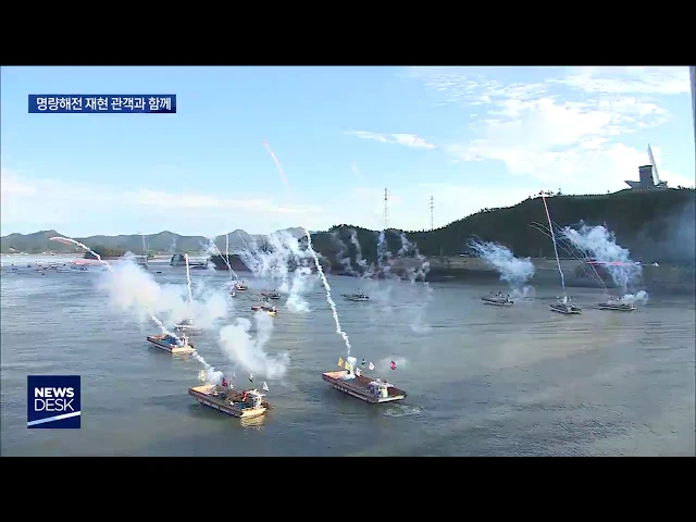 ◀ANC▶ 해남과 진도 울돌목에서는 421년 전. 명량대첩의 영광이 다시 꾸며졌습니다. 주민과 관객이 한데 어우러져 당시 생생했던 명량해전의 감동을 체험했습니다, 장용기기자입니다, ◀END▶ 최대 시속 24km 동양에서 물살이 가장 빠른 울돌목 협수로 밀물과 썰물이 뒤바뀌기 직전 잠시 물흐름이 멈춘 정조시각 왜군의 ...