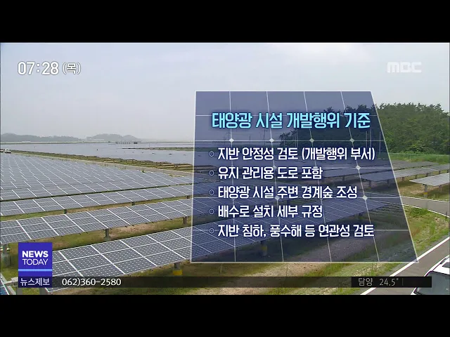◀ANC▶ 전국 곳곳에 태양광발전 시설이 들어서면서 주민들과의 마찰이 끊이지 않고 있습니다. 난개발로 인한 잡음을 막기 위해 전라남도가 전국 처음으로 태양광 시설 권고 기준을 마련했습니다. 박영훈 기자입니다. ◀END▶ ◀VCR▶ 농촌 마을 주민들이 농성을 벌이면서 수개월 째 건물 공사를 막고 있습니다. 민가와 ...