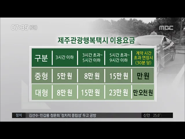 ◀ANC▶ 제주에서 운행하는 전세 택시는 그동안 음성적으로 계약이 이뤄지다보니 요금이 천차만별이었는데요, 바가지 요금 없는 '행복택시'가 시범운행을 시작했습니다. 제주MBC 홍수현 기자입니다. ◀END▶ ◀VCR▶ 관광행복택시 운행에 나서는 강성철 씨. 차량 외부에 관광행복택시 스티커를 붙이고, 내부에는 승객을 ...